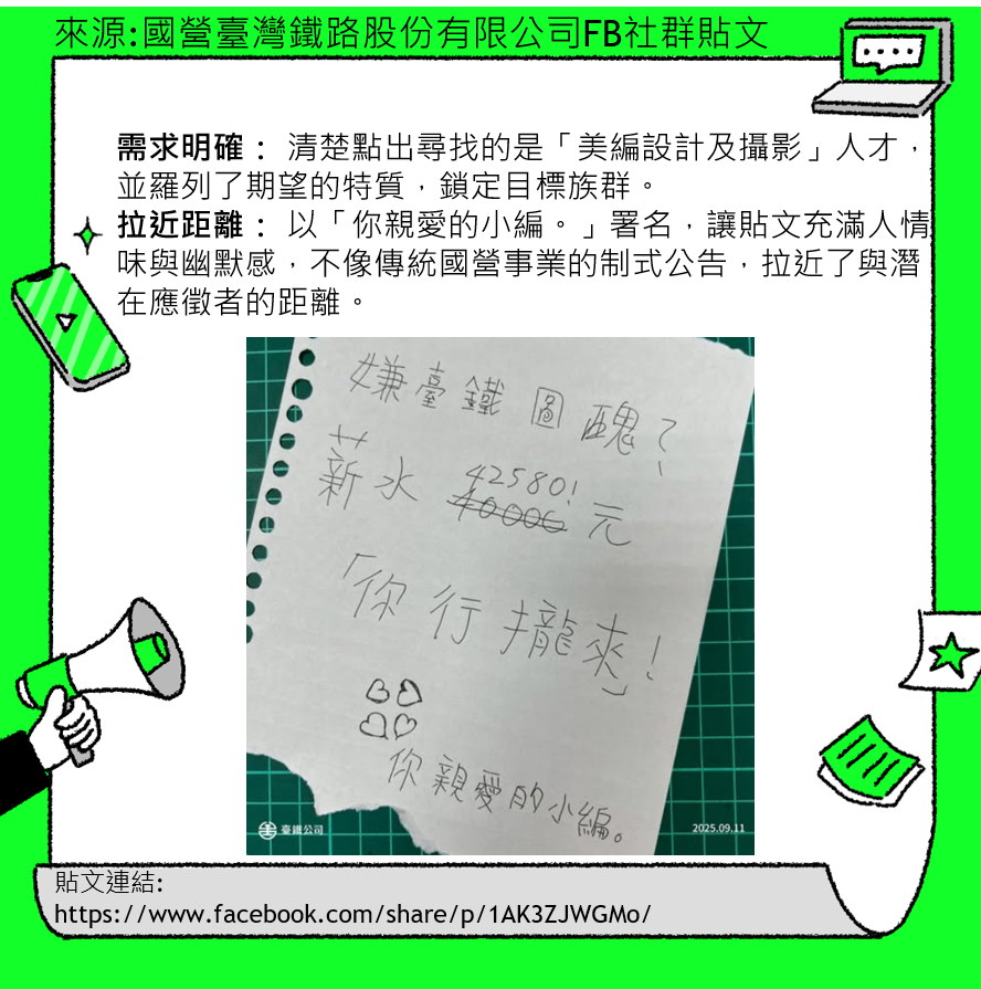 以「你親愛的小編。」署名,讓貼文充滿人情味與幽默感,不像傳統國營事業的制式公告,拉近了與潛在應徵者的距離。