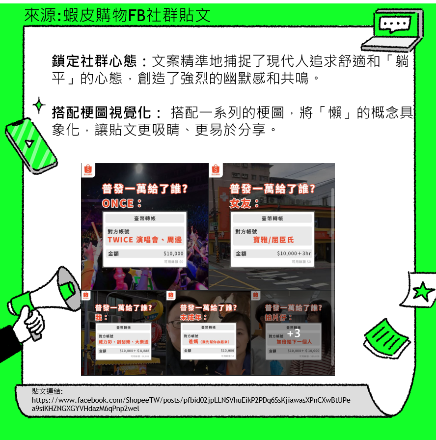 蝦皮購物FB社群貼文抓住熱點提高曝光:藉由模仿或引用知名網紅的熱門話題讓貼文觸及到該網紅的粉絲群,迅速擴大曝光率和討論度。 趣味性高,引發共鳴:以「中文好難」的幽默自嘲和發音測驗吸引注意
