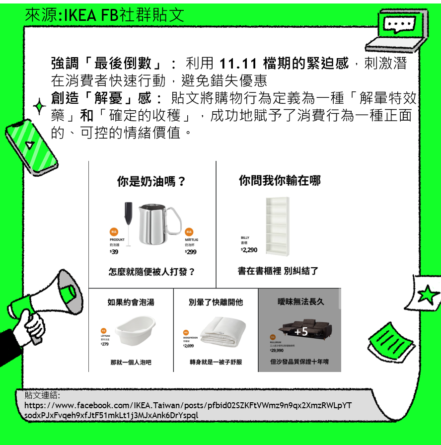 來源:IKEA FB社群貼文極致的在地化共鳴:熟悉的早安圖一出現,比任何精美的北歐風設計更能引起台灣消費者的討論與轉發。 把產品變成MEME:這些玩偶瞬間從架上的商品變成了有靈魂的角色。消費者買