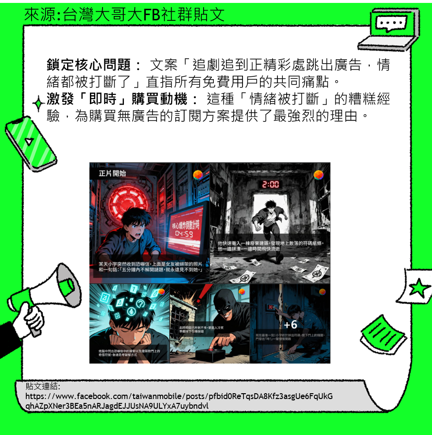 激發「即時」購買動機: 這種「情緒被打斷」的糟糕經驗,為購買無廣告的訂閱方案提供了最強烈的理由。