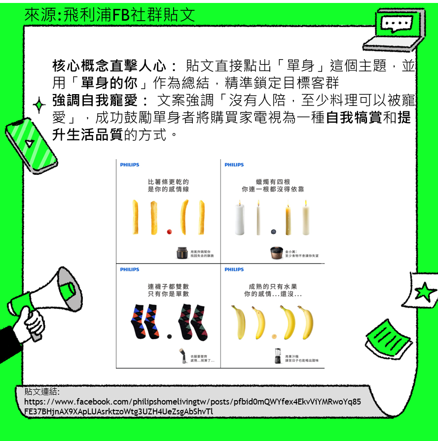 強調自我寵愛: 文案強調「沒有人陪,至少料理可以被寵愛」,成功鼓勵單身者將購買家電視為一種自我犒賞和提升生活品質的方式。
