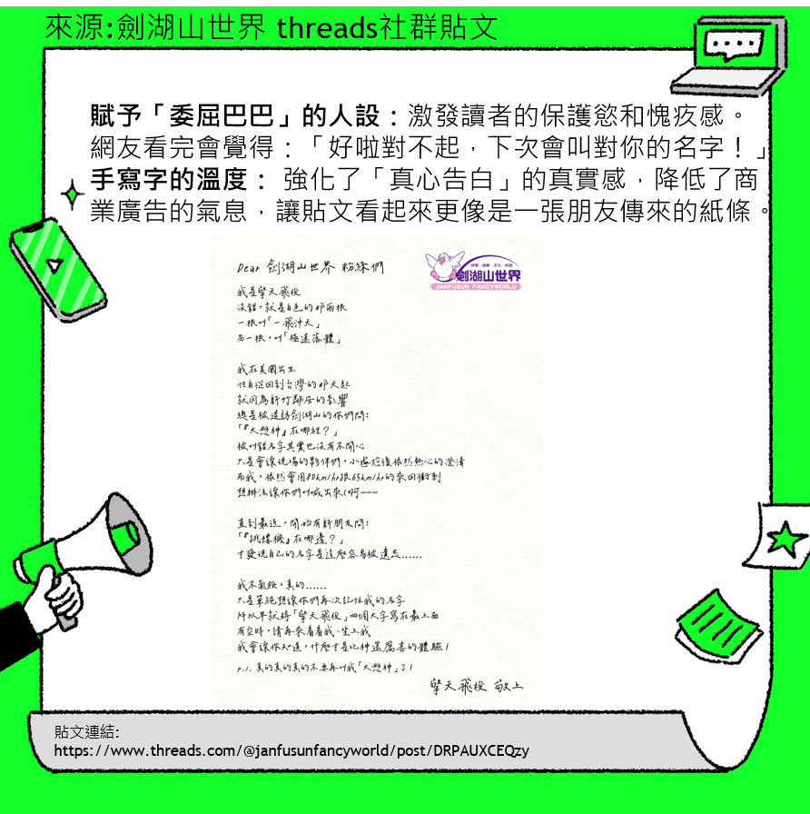 手寫字的溫度: 強化了「真心告白」的真實感,降低了商業廣告的氣息,讓貼文看起來更像是一張朋友傳來的紙條。