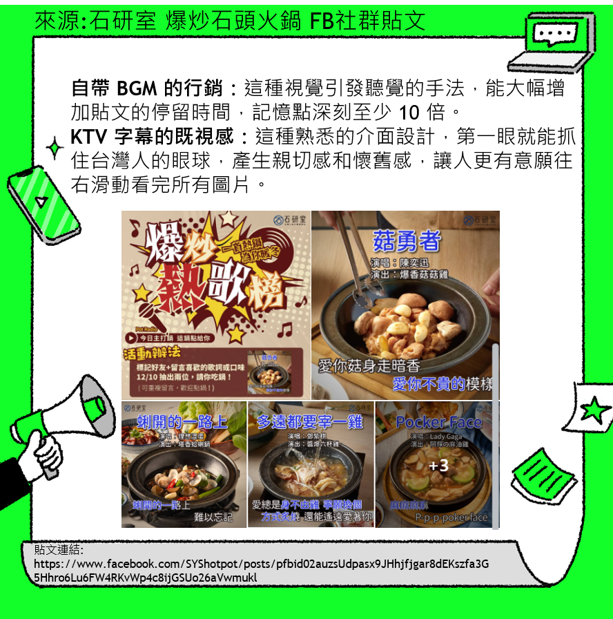 自帶 BGM 的行銷:這種視覺引發聽覺的手法,能大幅增加貼文的停留時間,記憶點深刻至少 10 倍。