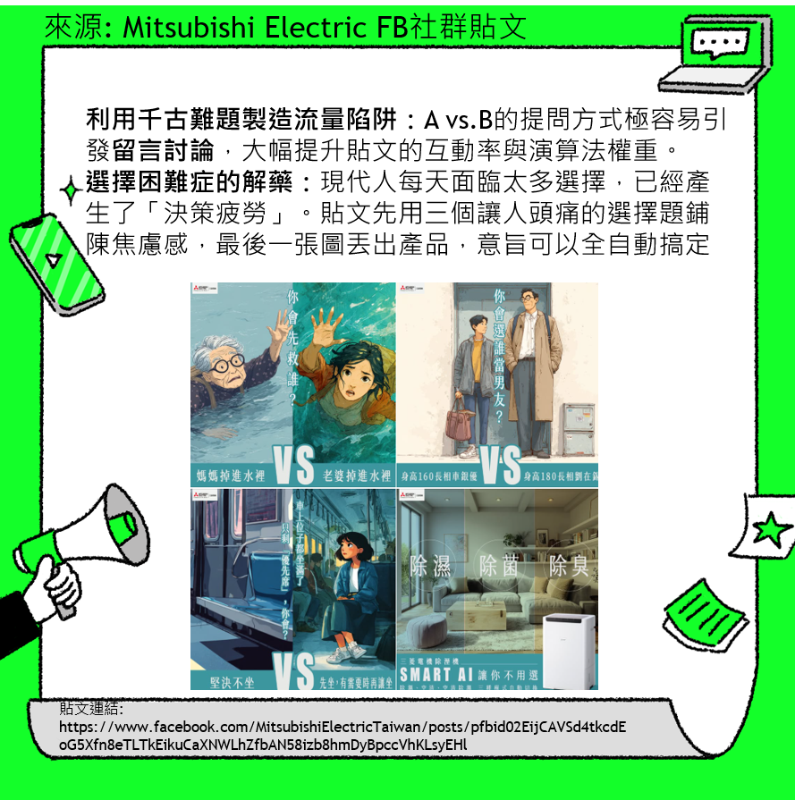 利用千古難題製造流量陷阱:A vs.B的提問方式極容易引發留言討論,大幅提升貼文的互動率與演算法權重。