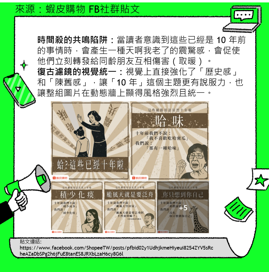 時間殺的共鳴陷阱:當讀者意識到這些已經是 10 年前的事情時,會產生一種天啊我老了的震驚感,會促使他們立刻轉發給同齡朋友互相傷害(取暖)。