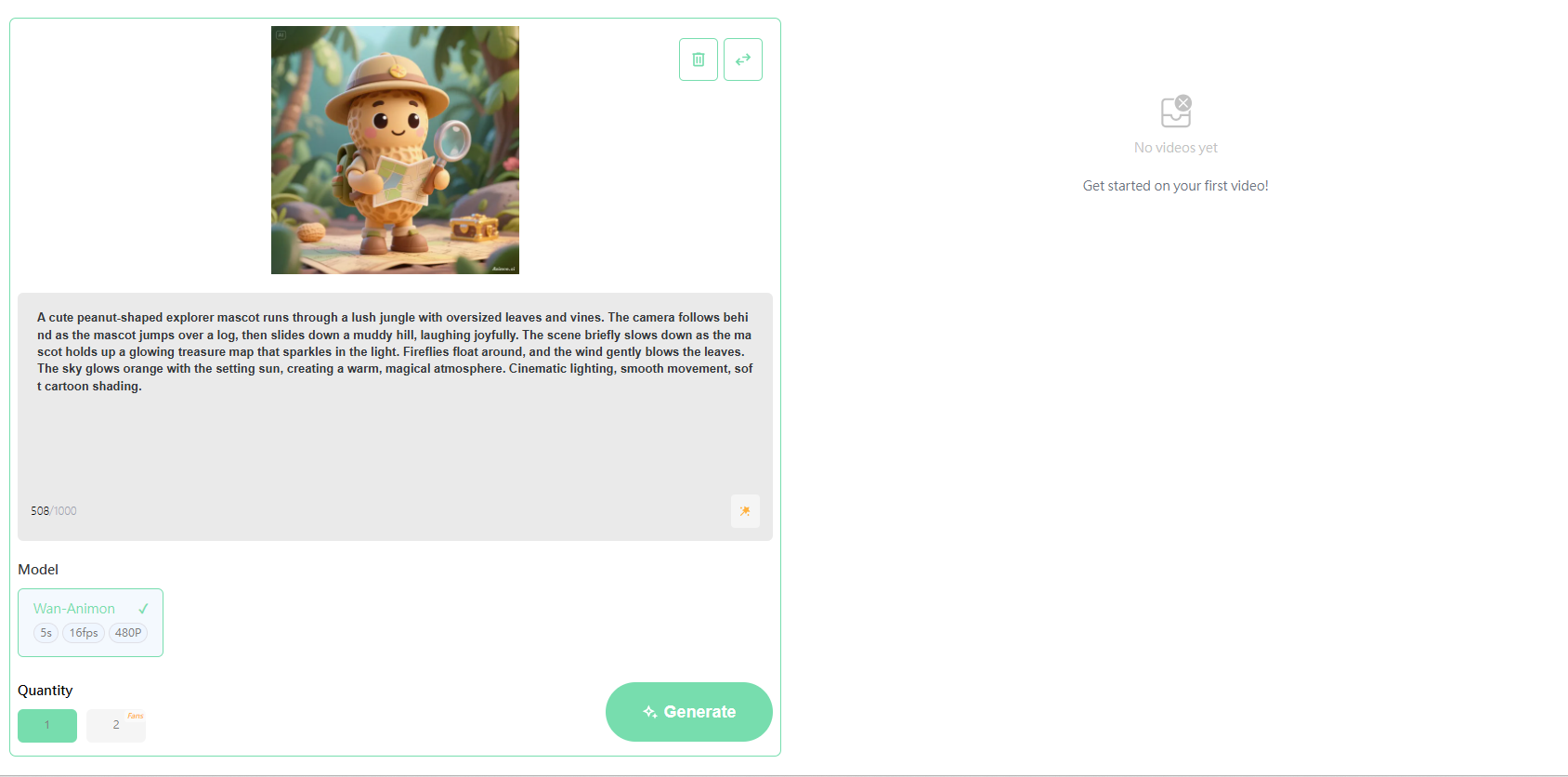 第四步:輸入動作提示詞在文字框中輸入你希望角色做的動作,例如本案例:A cute peanut-shaped explorer mascot runs through a lush jungle with oversized leaves and vines. The camera follows behind as the mascot jumps over a log, then slides down a muddy hill, laughing joyfully. The scene briefly slows down as the mascot holds up a glowing treasure map that sparkles in the light. Fireflies float around, and the wind gently blows the leaves. The sky glows orange with the setting sun, creating a warm, magical atmosphere. Cinematic lighting, smooth movement, soft cartoon shading.⚠️ 系統目前較懂英文,建議用英文輸入。可善用 ChatGPT 協助翻譯中文想法。