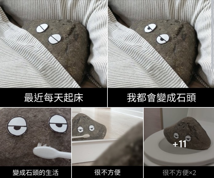 每張圖用極簡文字與表情營造節奏感與笑點,例如:「變成石頭的生活」「真的到處都好硬」「好貼合」「解除我的石化」。
