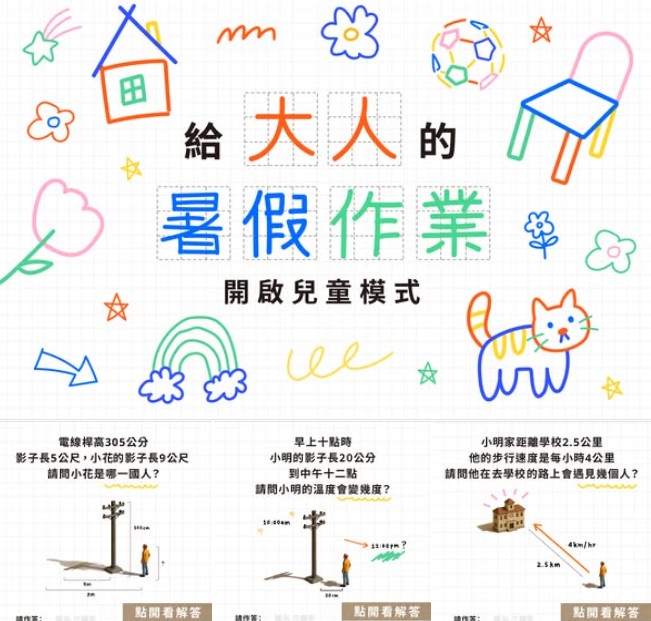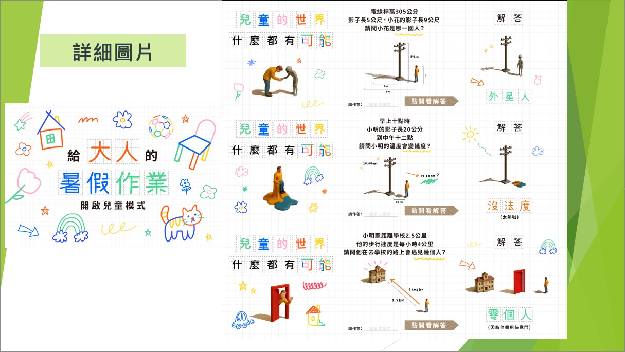 使用手繪線條、蠟筆色系與可愛塗鴉元素,營造出輕盈、富童趣的氛圍,加上 3D 公仔模擬互動場景,讓「題目」與「答案」兼具趣味性與視覺可看性,像翻閱一本會動的童書。