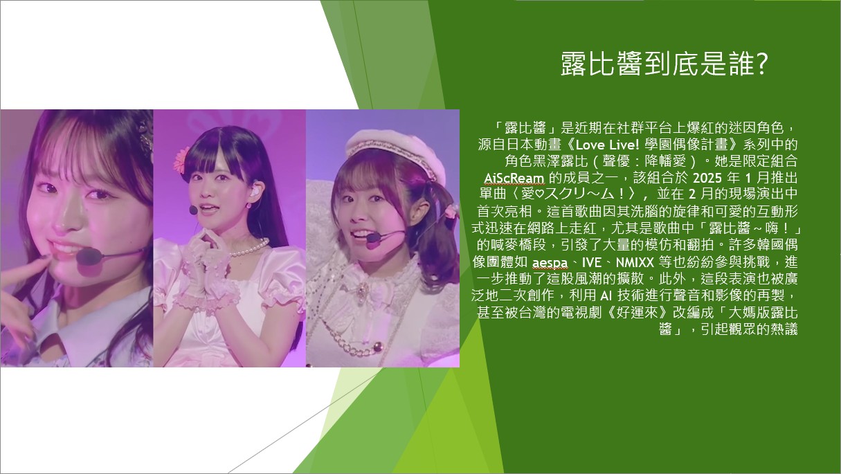 「露比醬」是近期在社群平台上爆紅的迷因角色,源自日本動畫《Love Live! 學園偶像計畫》系列中的角色黑澤露比(聲優:降幡愛)。