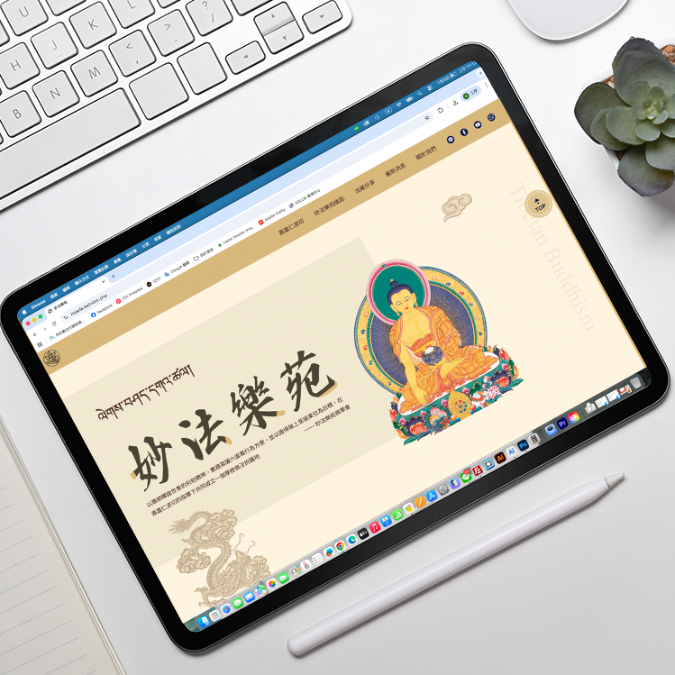 以佛像為核心的主視覺搭配米色與金色調,使網站呈現莊嚴、柔和且具辨識度的風格,讓訪客在首次瀏覽就能理解妙法樂苑的脈絡與精神。