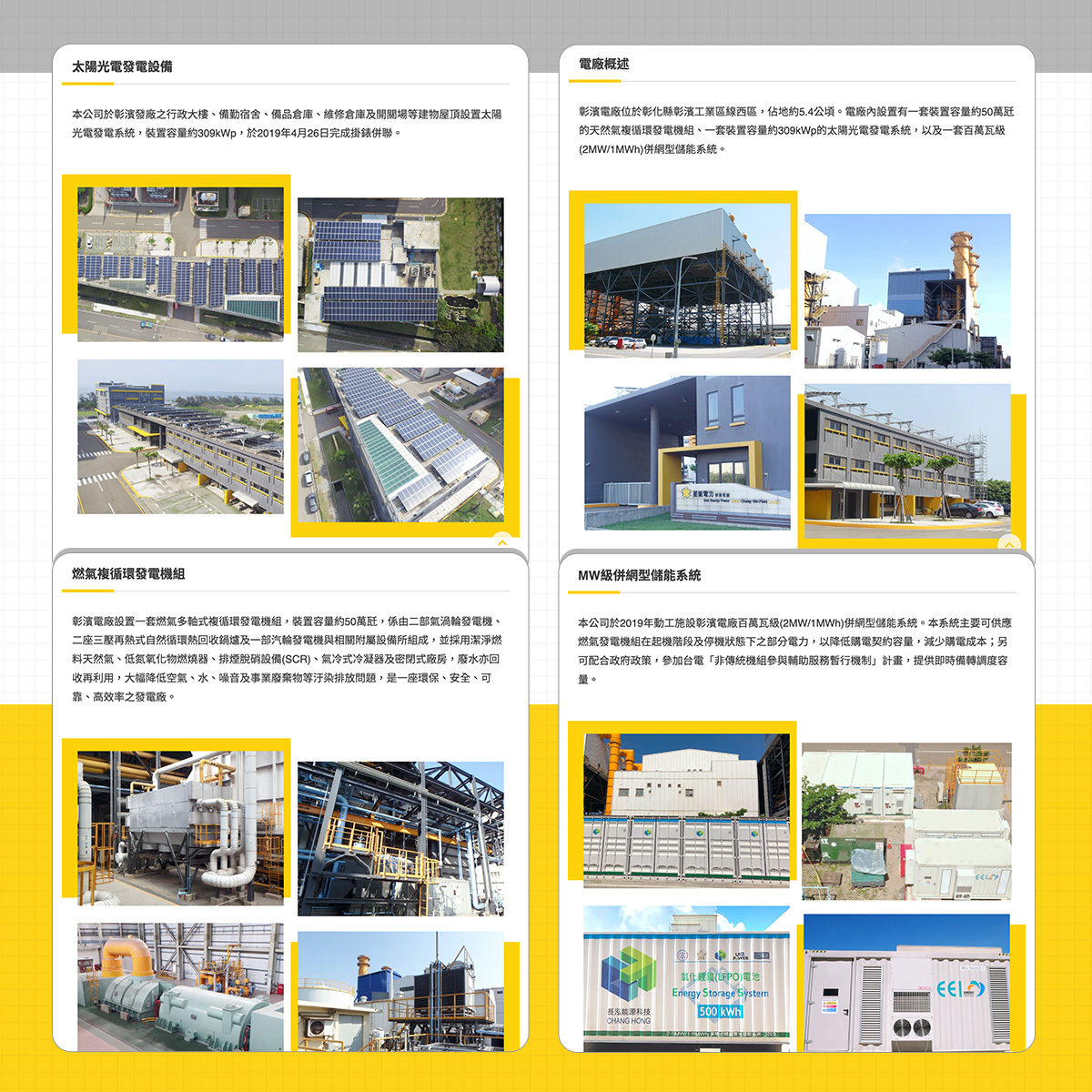 首頁資訊面板串接燃氣機組「即時發電量」(對接台電公開資料/API 來源),同時提供太陽光電每日發電量與儲能系統每日運作的後台更新功能,數據呈現清楚、延遲可控;全站以桌機/手機同步響應式設計,視覺素材由客戶提供統一風格。