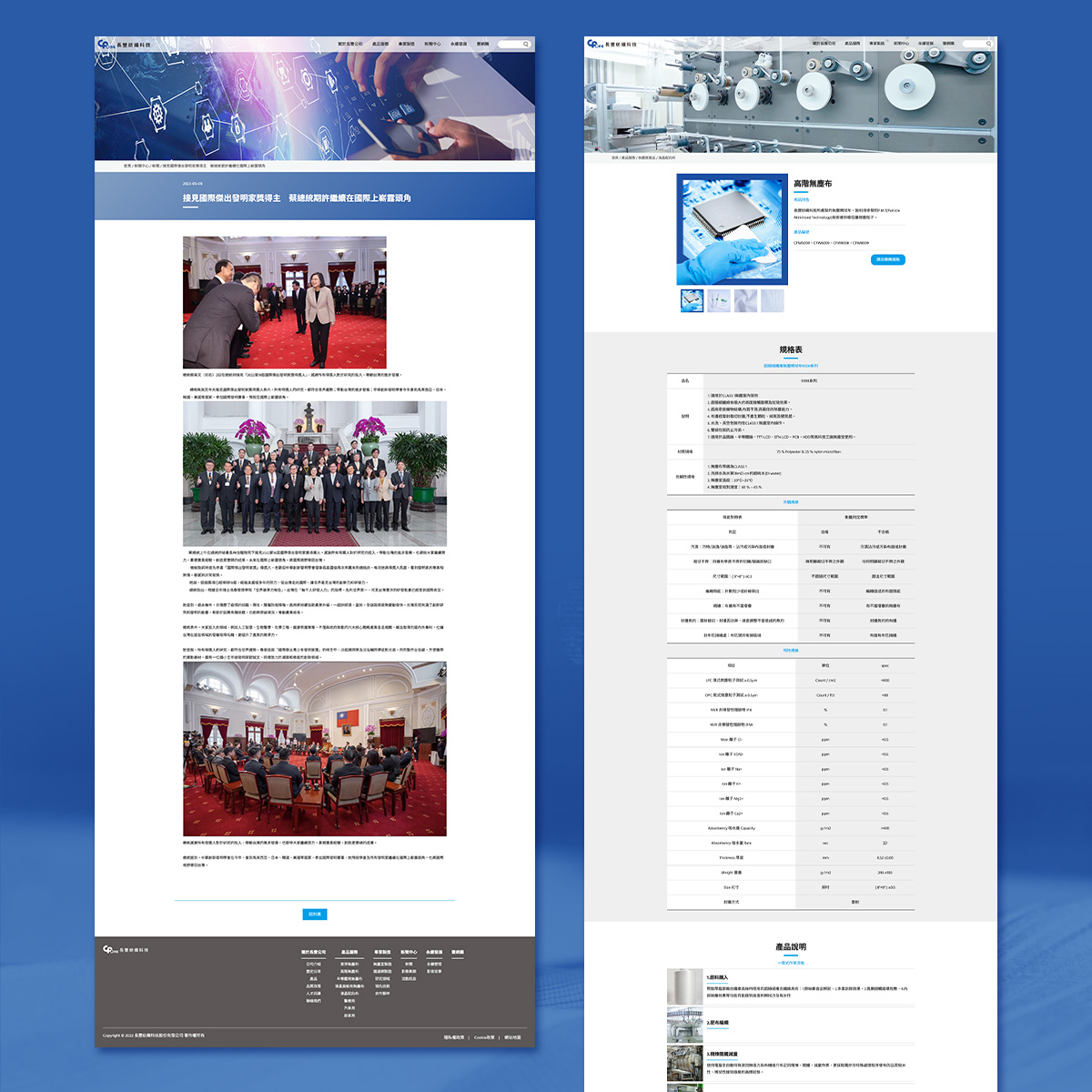 長豐紡織科技以「無塵室耗材與精密紡織」為核心,多年以來長豐公司一直致力於技術創新及品質提升,成為全球目前除日本之外唯一能生產此類高科技產品之專業製造商。新版官網整合企業精神、專業製造、研究領域、產品服務與永續專區,若想進一步了解,歡迎前往官方網站前往:長豐紡織官網