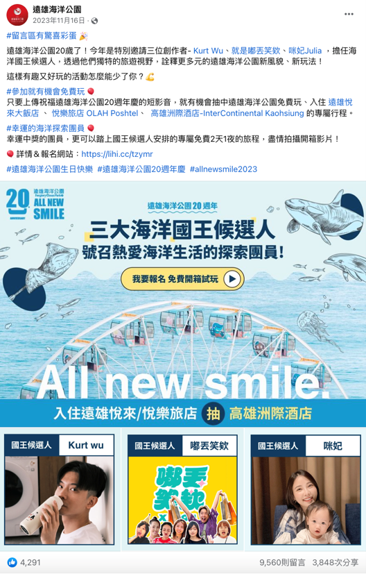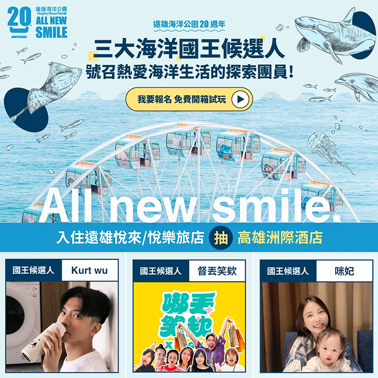 為呼應全新「海底王國」園區並搭上電影熱潮 ,我們策劃了「三大海洋國王候選人」網路活動 。我們邀請三組不同TA屬性的KOL擔任團長:Kurt Wu(質感潮男)、咪妃(親子族群)、就是嘟丟笑誒(趣味團體)