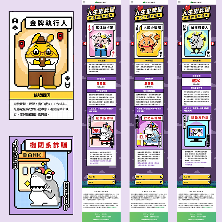 本專案以 MBTI 16 型人格為基礎,設計 20 題情境式題目與 16 種結果角色,並結合「鬼牌=詐騙風險」的創意隱喻,讓使用者在輕鬆作答的過程中,理解自身容易遇到的詐騙類型,同時自然認識 CUBE App 的即時通知、交易提醒與帳戶安全功能。