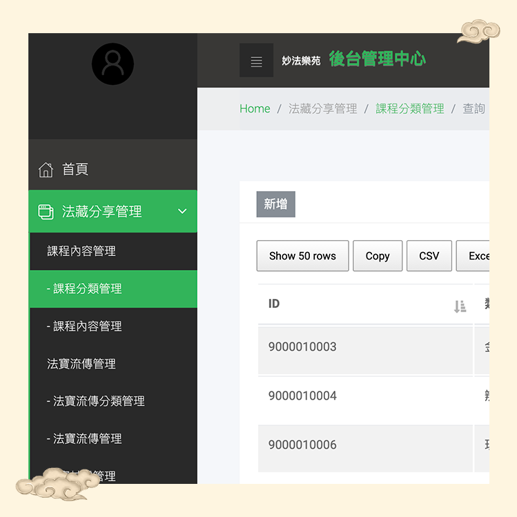 網站需包含課程、法語甘露、法藏分享等不同型態的內容,後台結構必須能依單元需求客製欄位,讓妙法樂苑佛學會團隊在日後能自行更新內容。