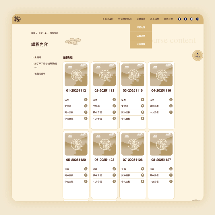 依內容屬性規劃清楚層級,將課程、法語、法藏與活動訊息以列表頁+內頁方式呈現,動線明確、視覺節奏一致。