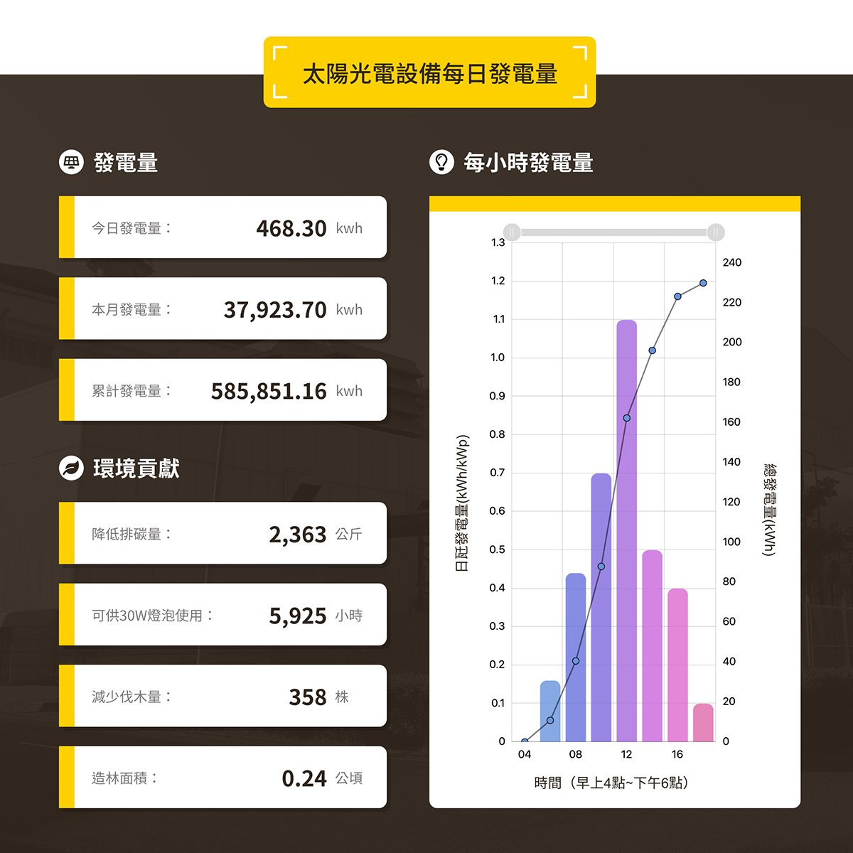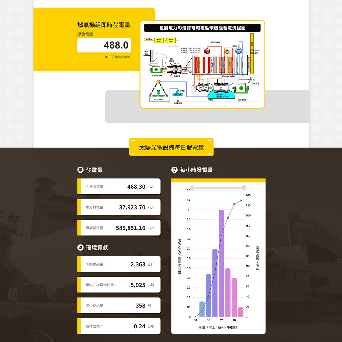 首頁資訊面板左側以 API 串接燃氣機組「即時發電量」,右側呈現可放大的機組流程圖,太陽光電「每日發電量」走 API 串接,與後台欄位對應,資料更新後即刻反應前台。