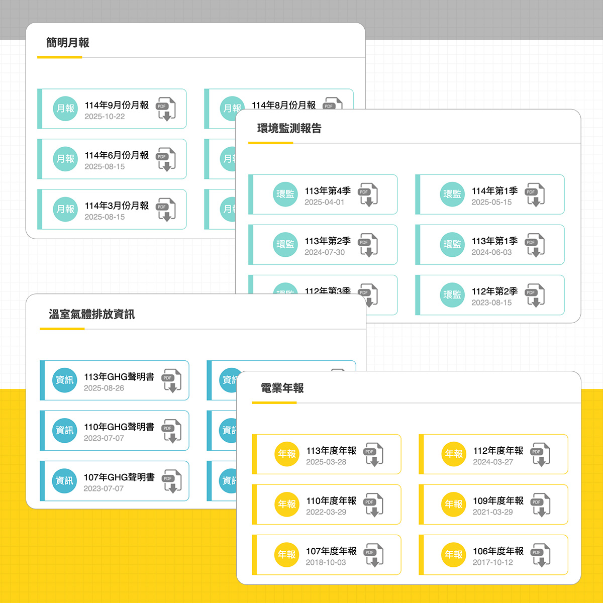 年報、月報、環境監測與溫室氣體資料集中到「資訊公開」,提供 PDF 下載與年份篩選;首頁再以「即時發電量」上牆,建立清楚且可驗證的公開機制。