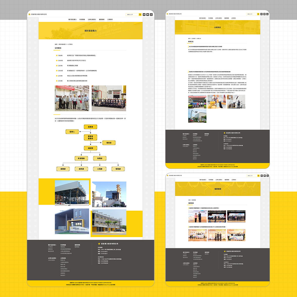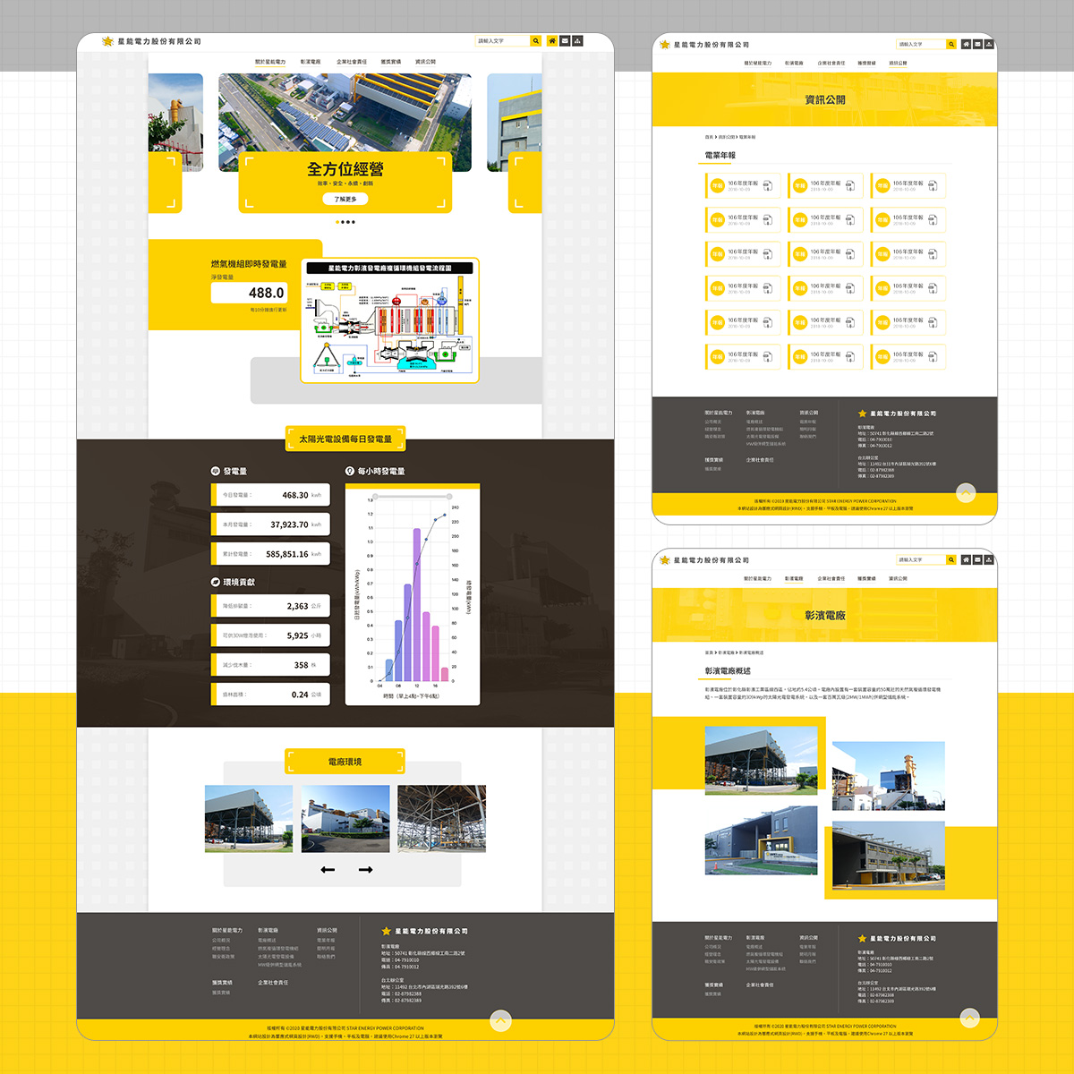 首頁資訊面板串接燃氣機組「即時發電量」(對接台電公開資料/API 來源),同時提供太陽光電每日發電量與儲能系統每日運作的後台更新功能,數據呈現清楚、延遲可控;全站以桌機/手機同步響應式設計,視覺素材由客戶提供統一風格。
