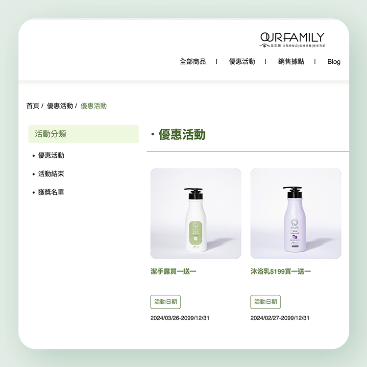 以「純淨、安心、無添加」為品牌核心,「OurFamily 一家人」致力於為每一個家庭提供值得信賴的日常用品。此次我們協助其打造官方電商網站,從視覺升級、購物體驗優化,到後台功能模組規劃,全面整合行銷推廣與會員經營,讓品牌精神在每一次點擊與消費中都被看見與感受。前往:OurFamily一家人髮肌保養