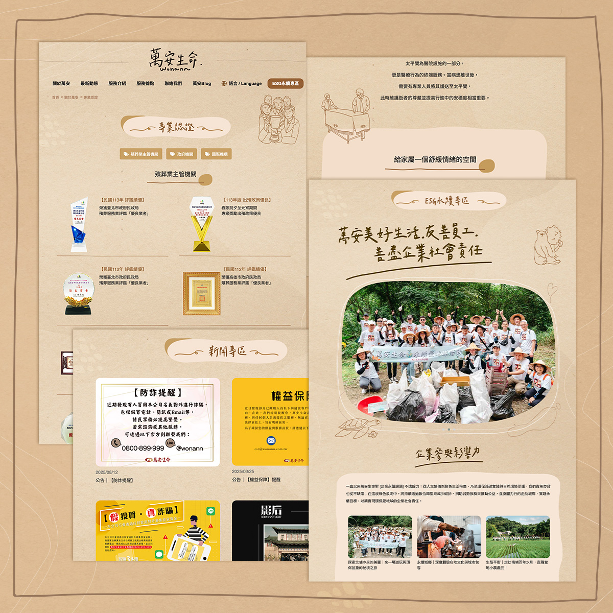 萬安生命,作為台灣殯葬業界的指標品牌,秉持「以人為本、以禮為尊」的精神,提供全方位的生命服務。此次改版聚焦於品牌形象升級與服務動線優化,透過溫潤典雅的視覺設計與人性化的資訊架構,打造出兼具信任感與使用便利的品牌官網。