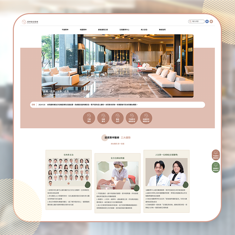 網站改版後,秉坤婦幼醫療整體品牌視覺更加一致,延續新LOGO的配色規劃,整體色調溫柔且具專業感,讓訪客在第一眼就能感受到醫療機構的信賴與溫度。重新設計的首頁與導覽架構,讓主要服務一目了然,呈現出現代化醫療品牌的全新形象。