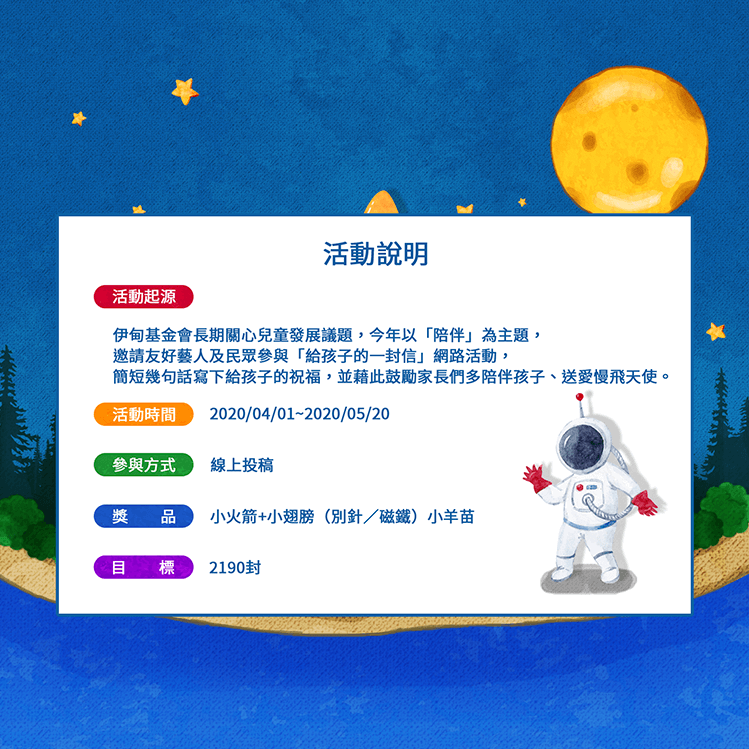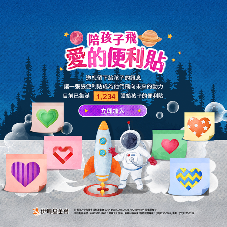 伊甸基金會為號召民眾一起陪伴孩子,我們特別打造《愛的便利貼》活動網站,以便利貼形式,邀請民眾一起來寫下對孩子的愛,不只是與自己的孩子對話、更可以寫給所有台灣的寶貝,把暖心祝福與愛寫下來,向慢飛天使傳遞溫暖。活動期間自2020/4/1至5/20,參與者可選擇便利貼樣式、留言並分享至社群。本活動同時集結多位友好藝人響應,民眾除了可以寫下自己的留言外,更歡迎把喜歡的名人留言分享出去,讓愛不斷擴散,同時提升早期療育議題的社會關注與參與行動。