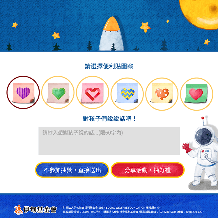 以「火箭升空」為主視覺,結合便利貼數量與動畫觸發,象徵集氣陪伴孩子飛得更高。