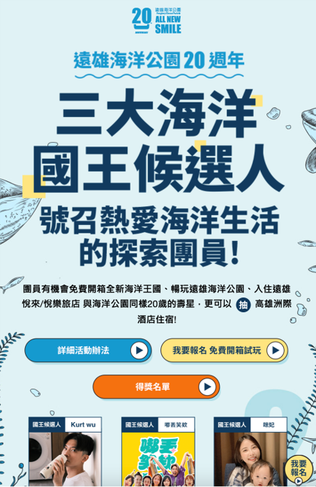 為呼應全新「海底王國」園區並搭上電影熱潮 ,我們策劃了「三大海洋國王候選人」網路活動 。我們邀請三組不同TA屬性的KOL擔任團長:Kurt Wu(質感潮男)、咪妃(親子族群)、就是嘟丟笑誒(趣味團體)